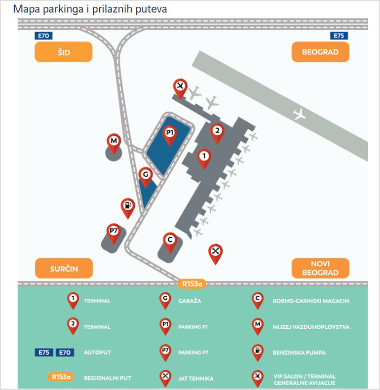 Aerodrom je jedna od najposećenijih i najprometnijih objekata u Beogradu. Do njega dolaze putnici iz cele Srbije, zbog čega je važno da postoji dovoljan broj parking mesta. Na aerodromu se nalaze tri parkinga, dva otvorena i jedna garaža.