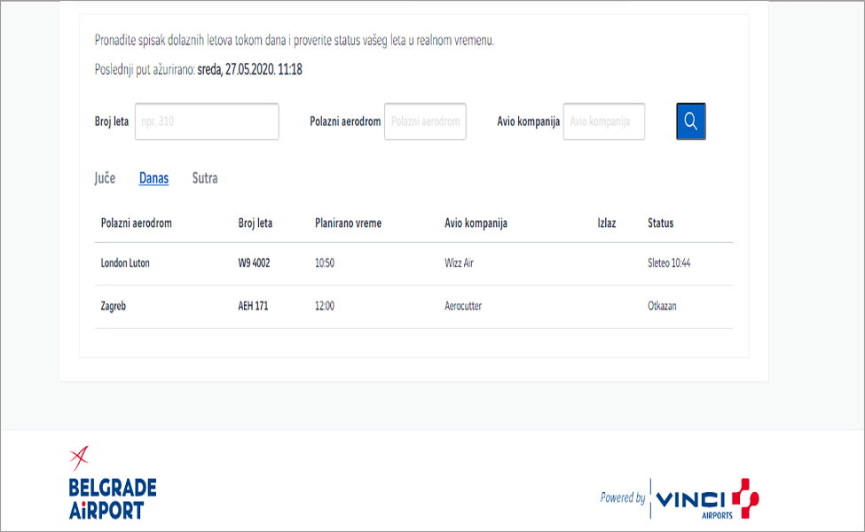 Na zvaničnom veb sajtu aerodroma Nikola Tesla možete pratiti kretanje letova uživo, dolaske i polaske, kao i dobiti informacije o sezonskom redu letenja. Sve informacije o dolaznim i odlaznim letovima tokom dana, otkazanim i pomerenim letovima možete dobiti kada ukucate broj leta, polazni aerodrom i avikompaniju. Informacije se ažuriraju svakoga dana.