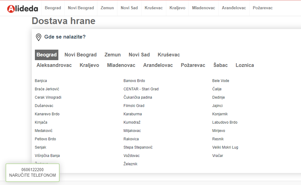 Slično kao i kod ostalih servisa za online poručivanje hrane i Alideda će Vam znatno olakšati put do ukusne hrane. Pomoću ovog servisa možete izabrati određeni deo grada i sva naselja koja on obuhvata i na taj način videti restorane domaće kuhinje, fast food restorane, pekare i restorane internacionalne kuhinje koji dostavljaju na Vašu adresu.