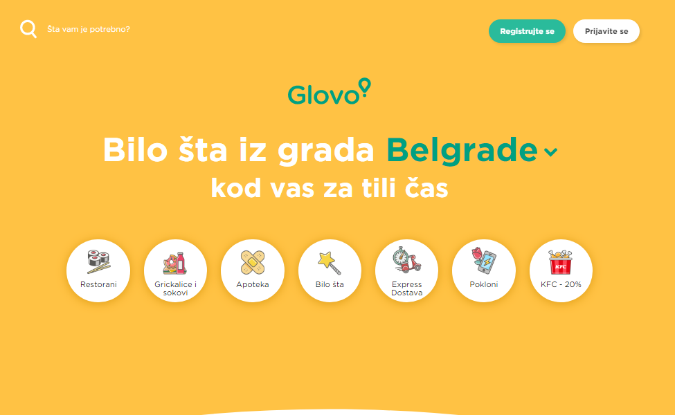 GLOVO je popularni start-up, koji nam dolazi iz Španije. Prepoznatljiv je po žutim i zelenim bojama, kao i po neverovatnim uslugama. Slično kao i Potrčko dostava, pomoću GLOVO aplikacije možete poručiti hranu i druge potrebne sitnice, kao što su pokloni, grickalice i sokovi, kao i sve drugo što Vam padne na pamet. GLOVO aplikacija se najčešćše koristi za poručivanje jela iz restorana i uvek će Vas obaveštavati o aktuelnim popustima u restoranima.