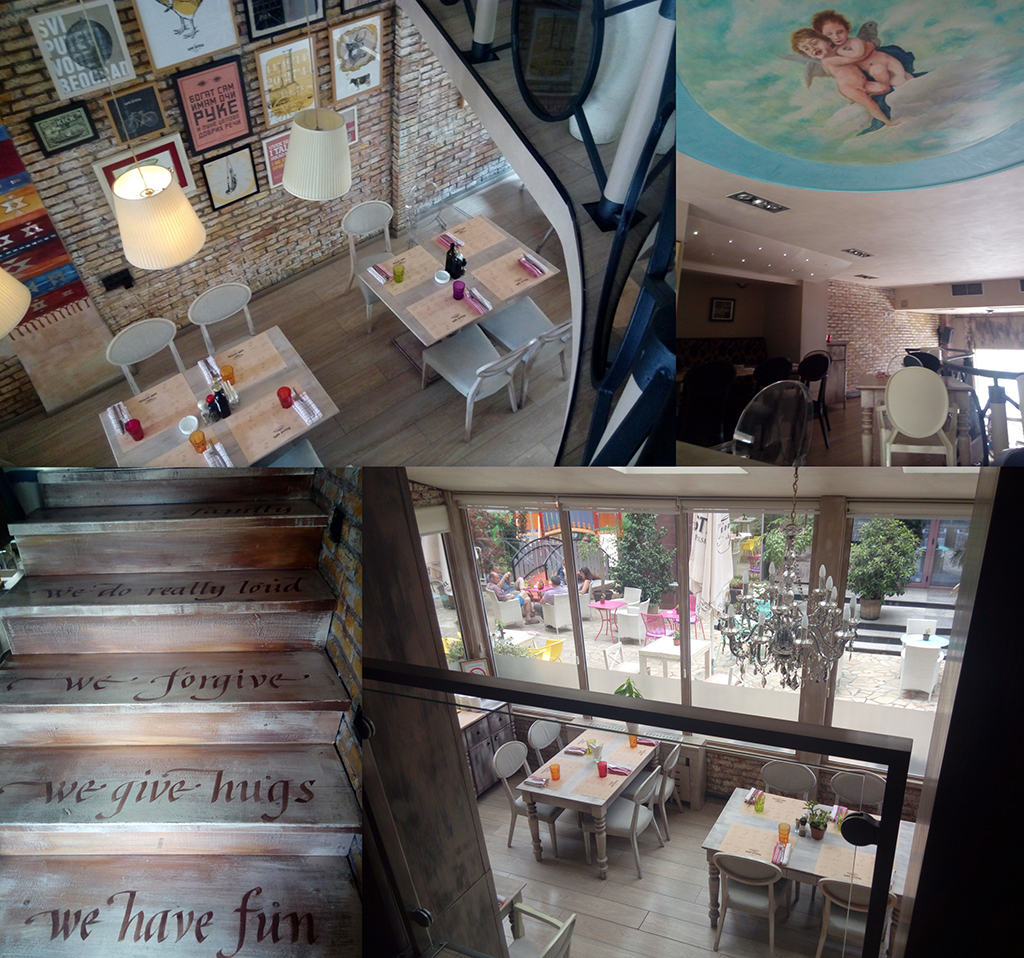 Restoran se sastoji iz dva dela i pored toga ima galeriju i baštu. Iskreno ne zna se koji je deo lepši od kog. U prvom delu, na koji ćete naići čim uđete nalaze se stolovi i separei, tu su i stepenice za galeriju, ako prođete pored stepenica ući ćete u drugi deo. Ako Vas prvi deo restorana i galerija ne budu oduševili, drugi deo će Vas ostaviti bez teksta. Možda ćete u prvom trenutku biti i pomalo zbunjeni, jer ćete imati utisak da ste ušetali u nečiju dnevnu sobu.