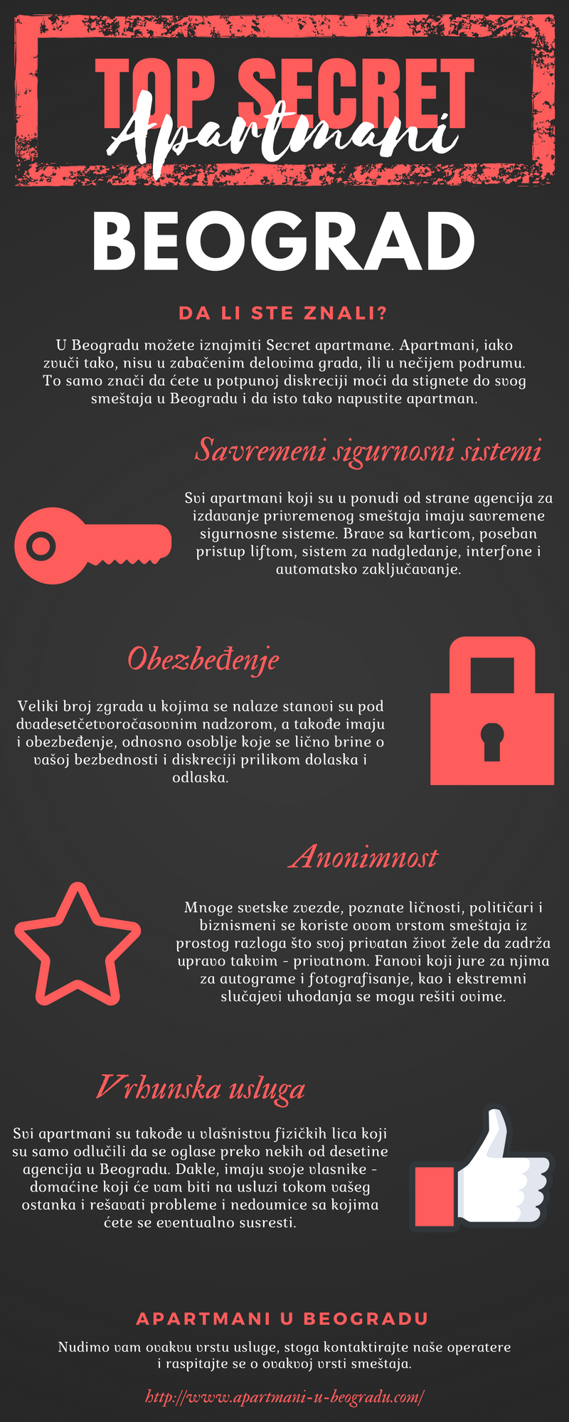 Top Secret apartmani u Beogradu su česta pojava, i neretko ovakvu vrstu usluge kosriste poznate ličnosti, političari, biznismeni, i svetske zvezde. Svim agencijama za izdavanje smeštaja je kod ovakve vrste gostiju najbitnije da pruže apsolutni komfor i privatnost. U sledećem infografiku ćete imati priliku da se upoznate sa ovom vrstom usluge i zašto je toliko popularna.