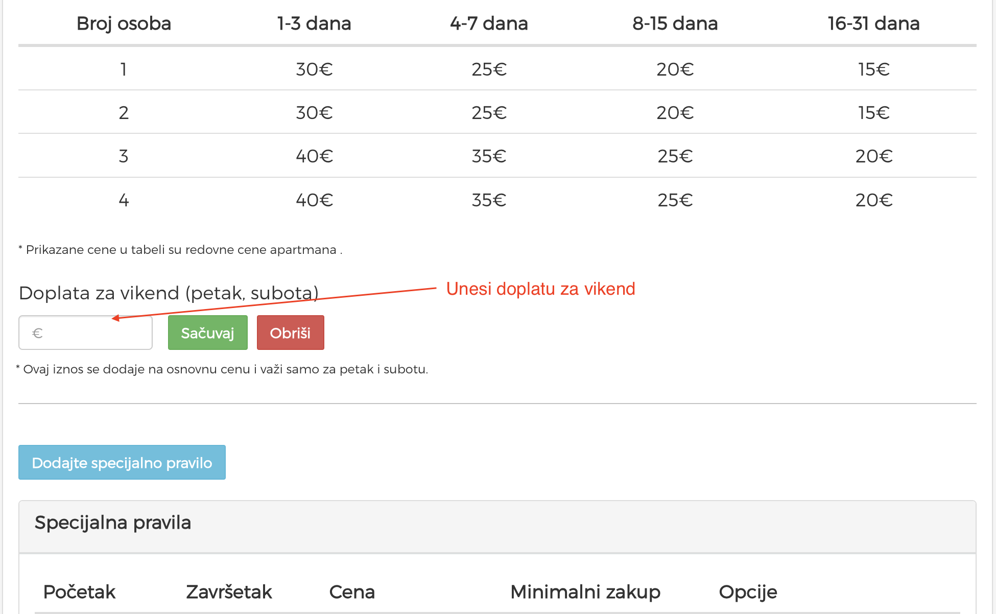4. Kako pravilno uneti iznos doplate  - Kliknite u polje ispod natpisa "Doplata za vikend" i unesite iznos u evrima. Unosi se samo broj (npr. 20 za 20€). ne stavljajte znak „€“, polje prihvata samo numeričku vrednost. Ovaj iznos doplate će važiti za oba dana petak i subotu i biće dodat na osnovnu cenu. Na primer, ako vam je osnovna cena za period od 1-3 dana 30€, doplata 20€ u tom slučaju cena će petkom ili subotom biti 50€ samo u slučaju ako gosti rezervišu period od 1 do 3 noćenja. Ako gosti izaberu period noćenja veći od 3 dana a manji od 7 primeniće se osnova cena za period od 4-7 dana to je 25€ i na nju dodati doplatu za vikend 20€ pa će cena samo za petak i subotu u ovom slučaju biti 45€.